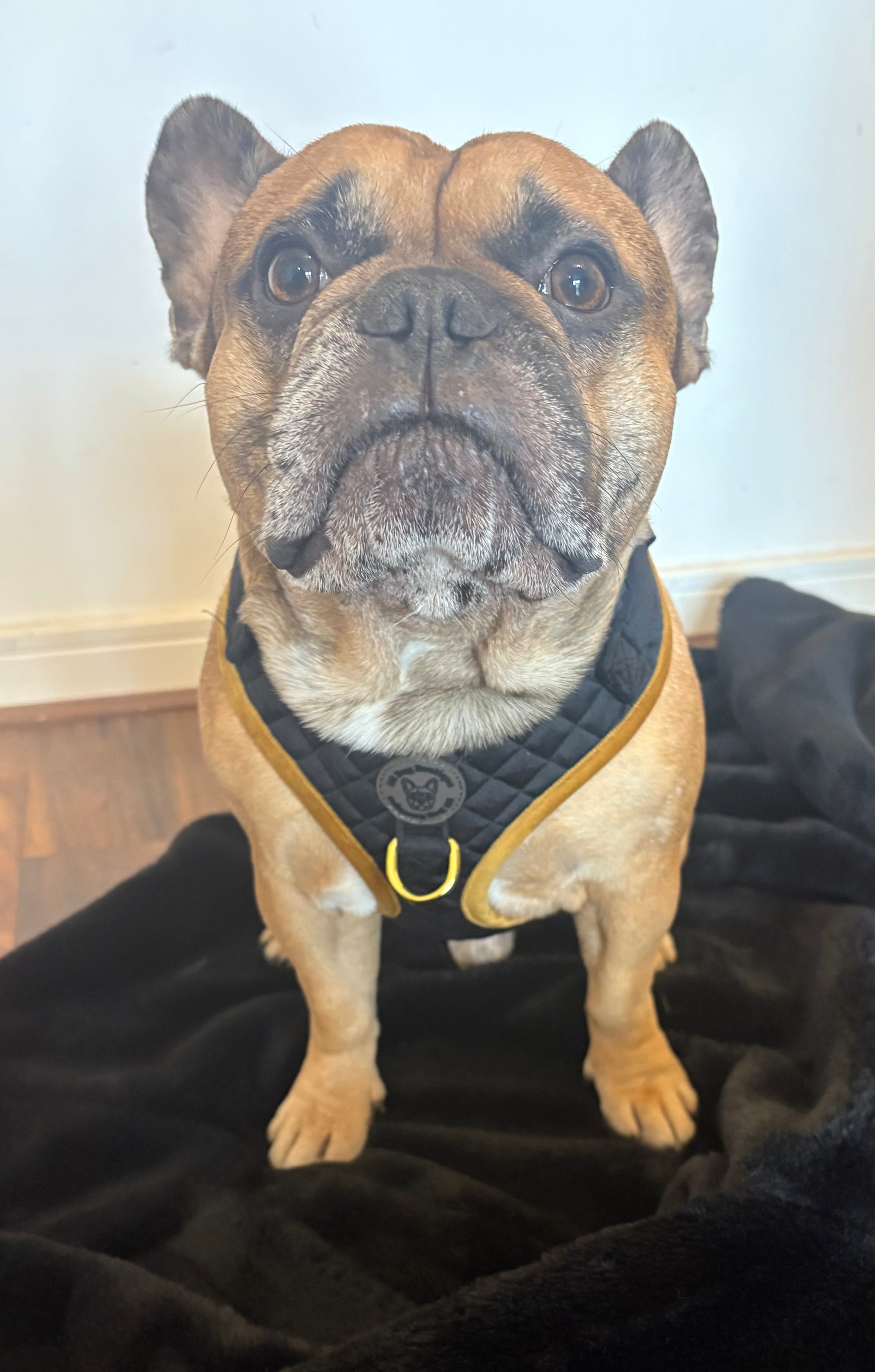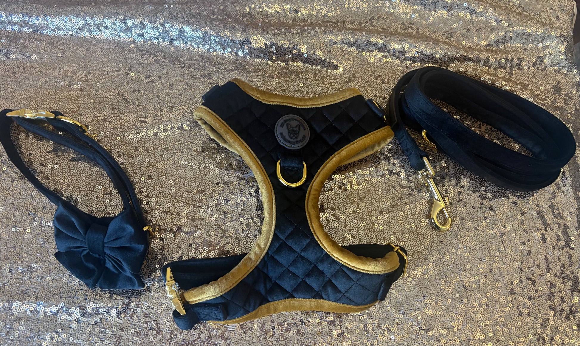 Black quilted velvet harness with gold trim. With gold hardware and two clips for lead / tag.Other matching items available.Material used is velvet, machine washable at 30 degrees. Please measure your pet before ordering.